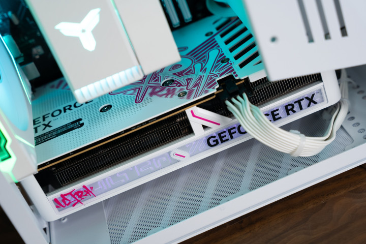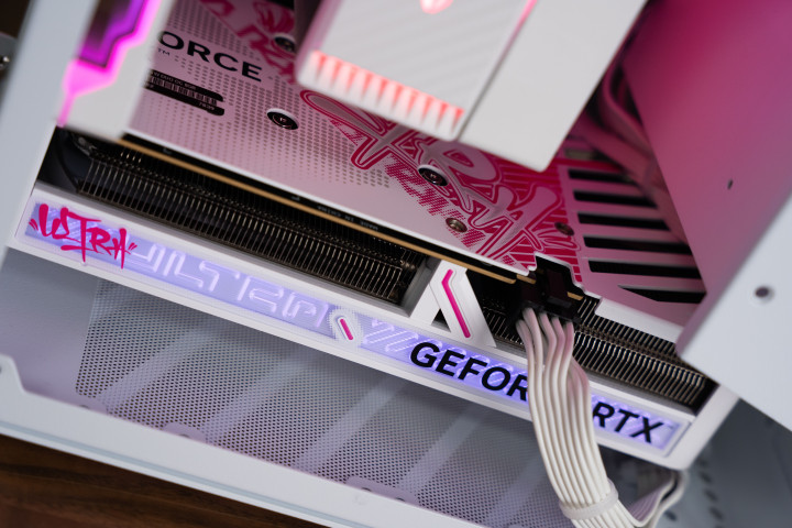 而这块双风扇的显卡塞进迷你主机中也显得非常紧凑可爱,通电时显卡前面也会亮起文字的RGB